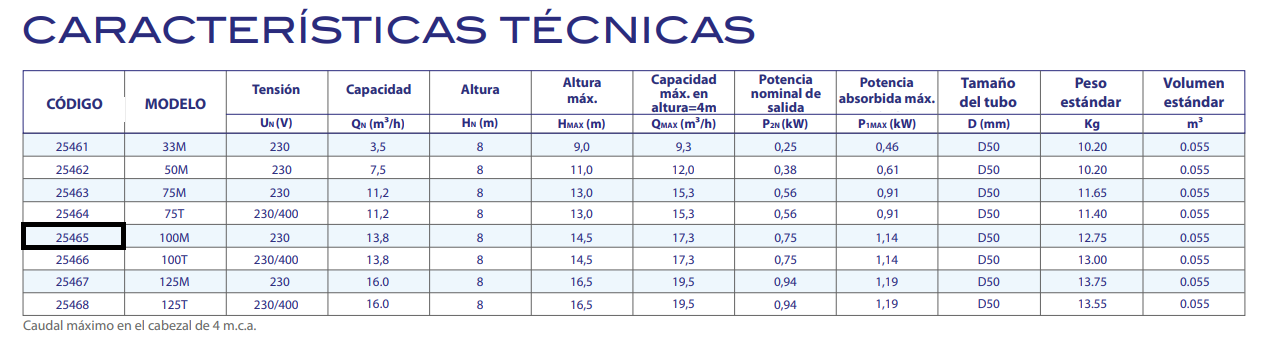 En esta tabla podemos observar tanto el cuadal como la potencia de nuestra bomba.