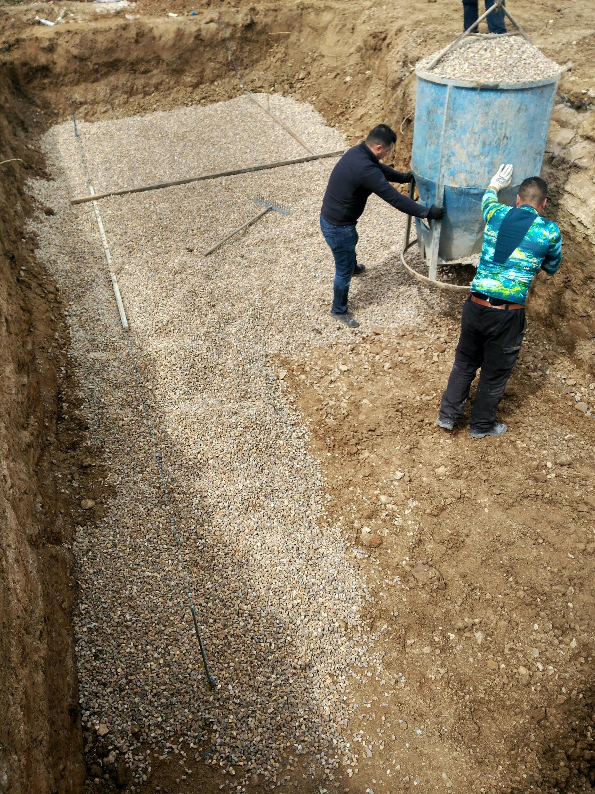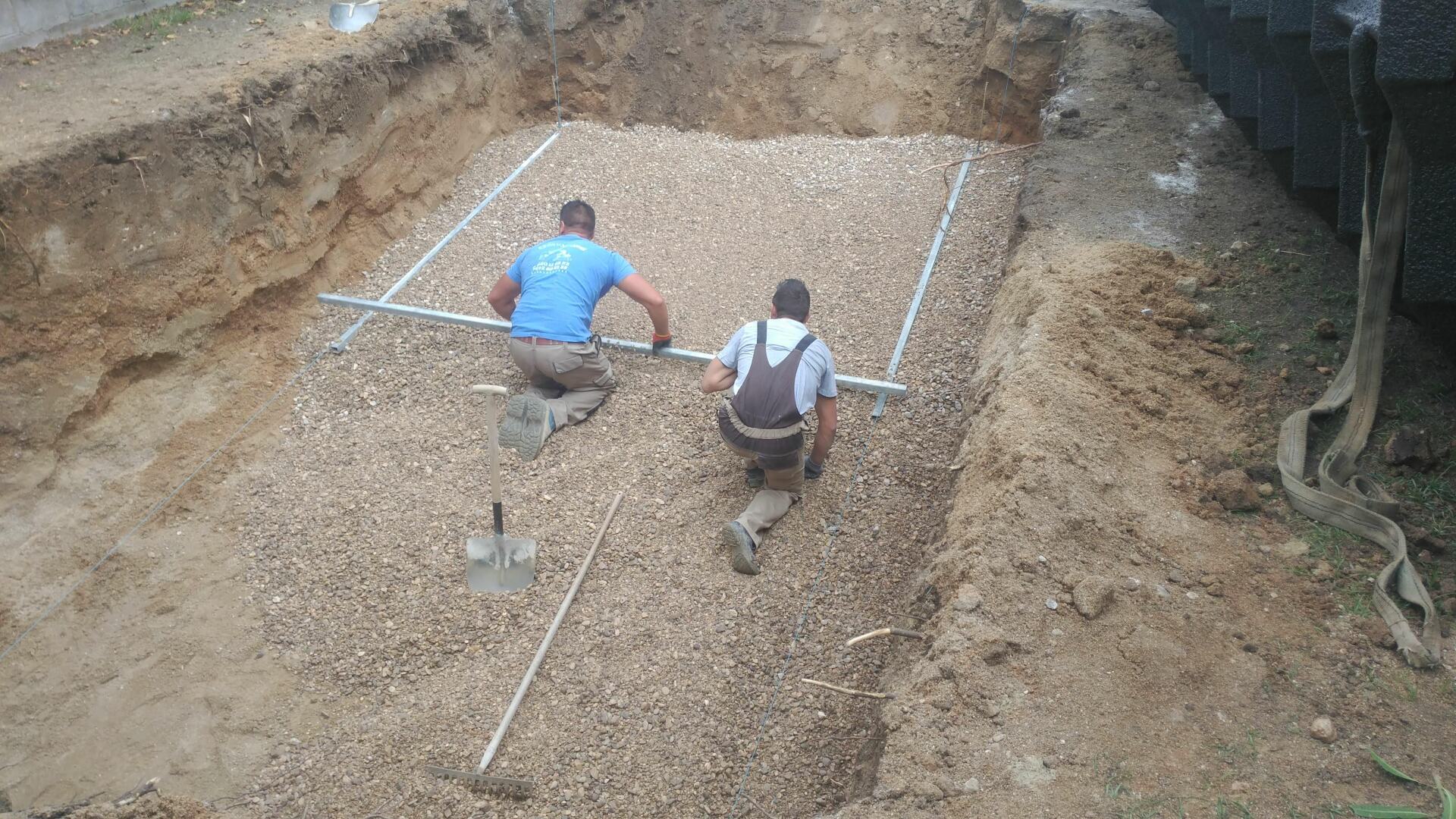 Se rellena la base del agujero con grava a un nivel muy preciso para la perfecta colocación del vaso. Meticulosamente se transporta el vaso desde el camión grúa y se asienta sobre la cama de grava (nunca de hormigón: porque no se adapta al terreno y puede romper por la concentración de tensiones generadas por el terreno y agrietar el vaso).